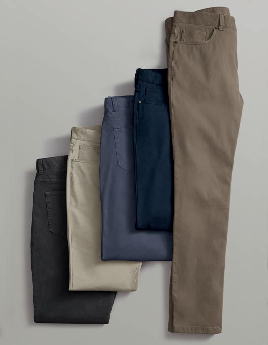 Comfortable fabrics and flattering fits? Expect both from our formal and casual men's pants. Our chinos are bestsellers for good reason – they feature non-iron finishes, super-soft textures, and slight stretch for comfort. To complete business looks, choose 5-pocket men's smart pants in versatile shades of charcoal, navy, and mocha.